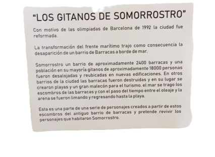 Somorrostro un barrio de aproximadamente 2400 barracas y una población en su mayoría de gitanos, donde aproximadamente 18000 personas fueron desalojadas y reubicadas en nuevas edificaciones en otros barrios de la ciudad.